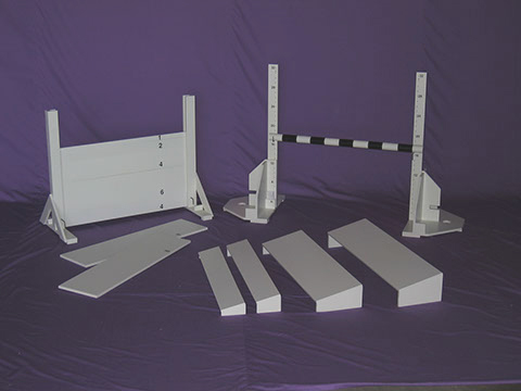 Surfaces painted white with a black striped bar. Locking pins to hold jumps secure.