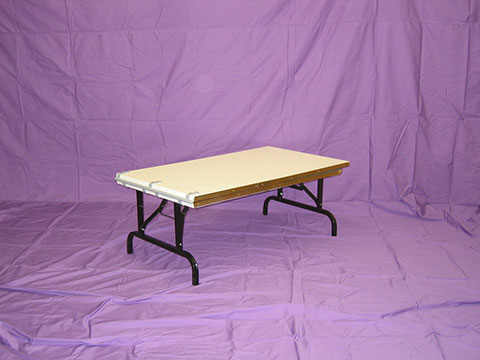 This table has wheels on one end, so one person can easily maneuver it.